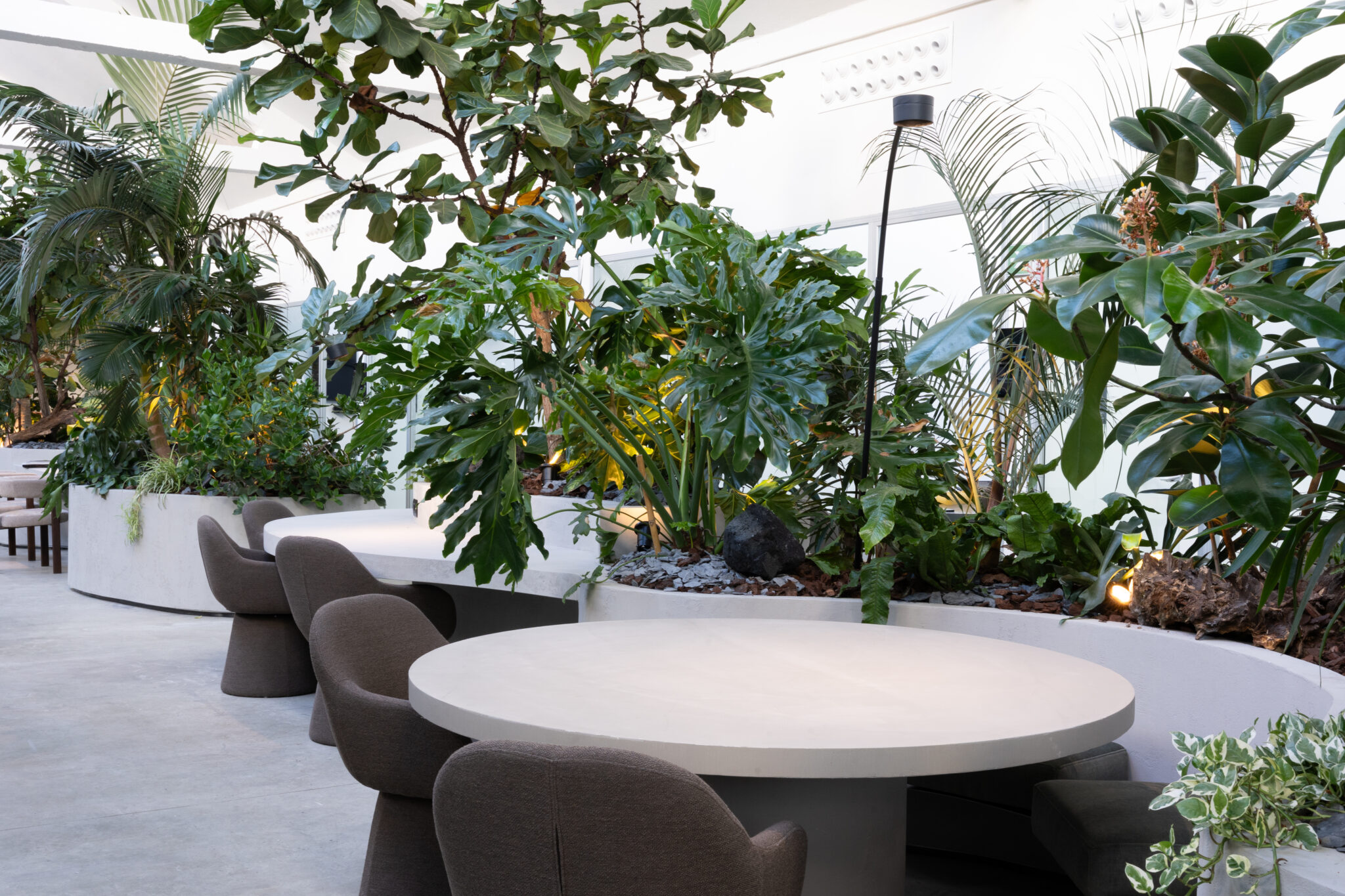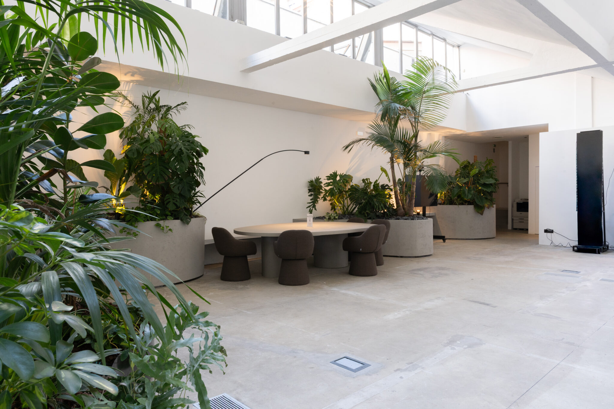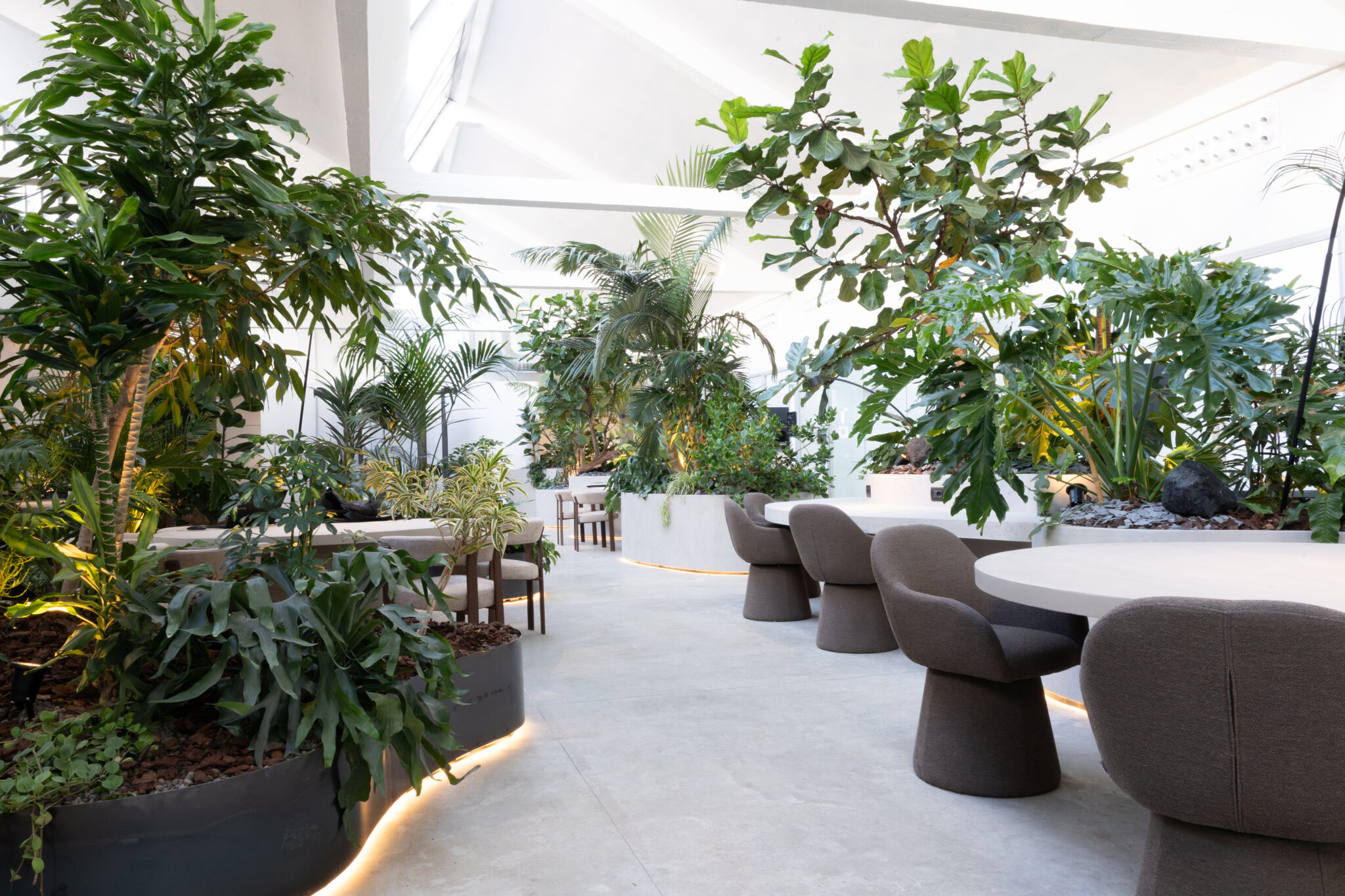 Un’area centrale di grandi dimensioni si apre su diverse zone connesse tra loro: ambienti vetrati, percorsi interni continui, spazi più raccolti e aree verdi integrate che scandiscono e separano le funzioni. La distribuzione favorisce la modularità e la lettura chiara dello spazio, mantenendo continuità visiva e profondità.