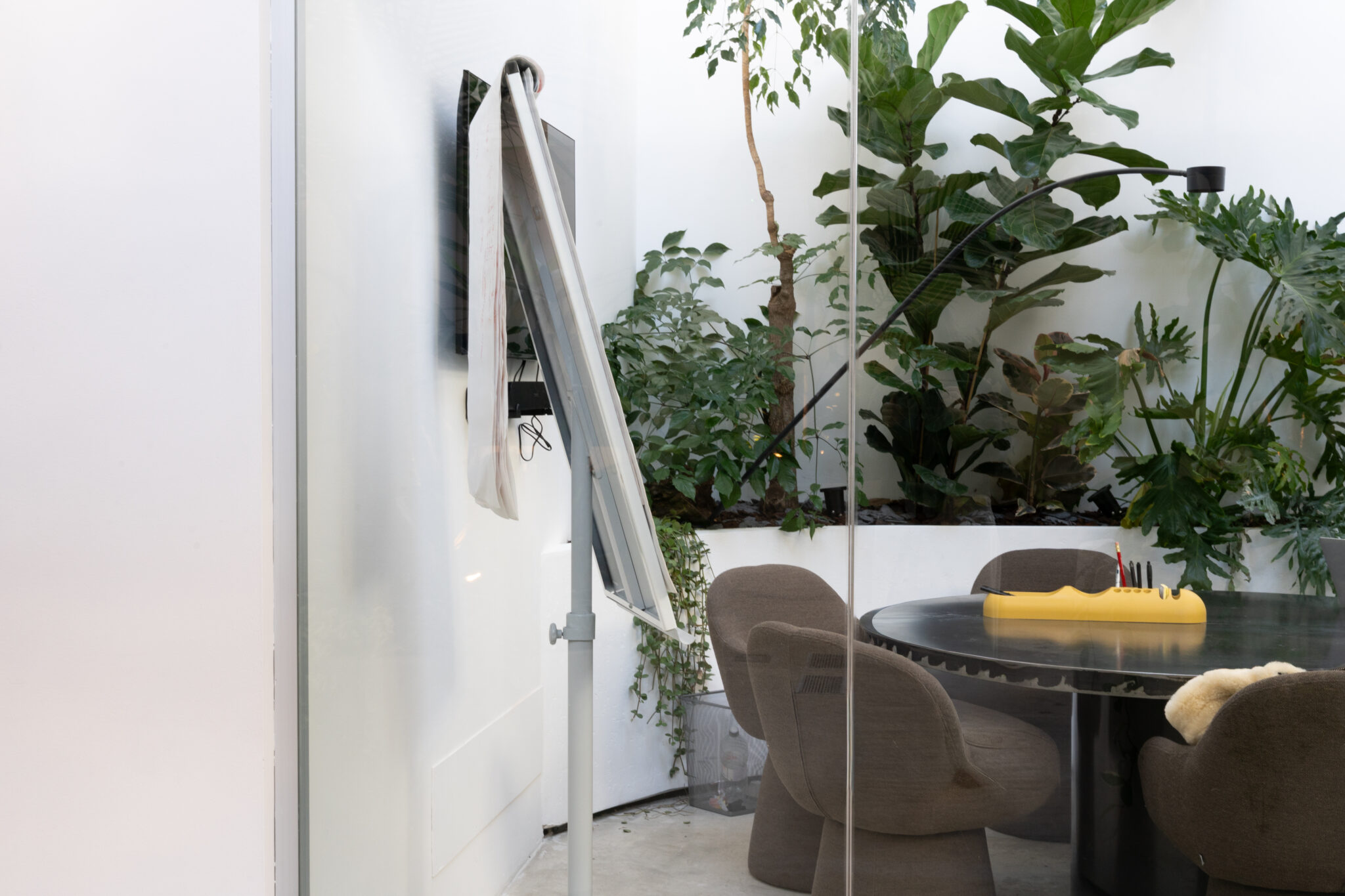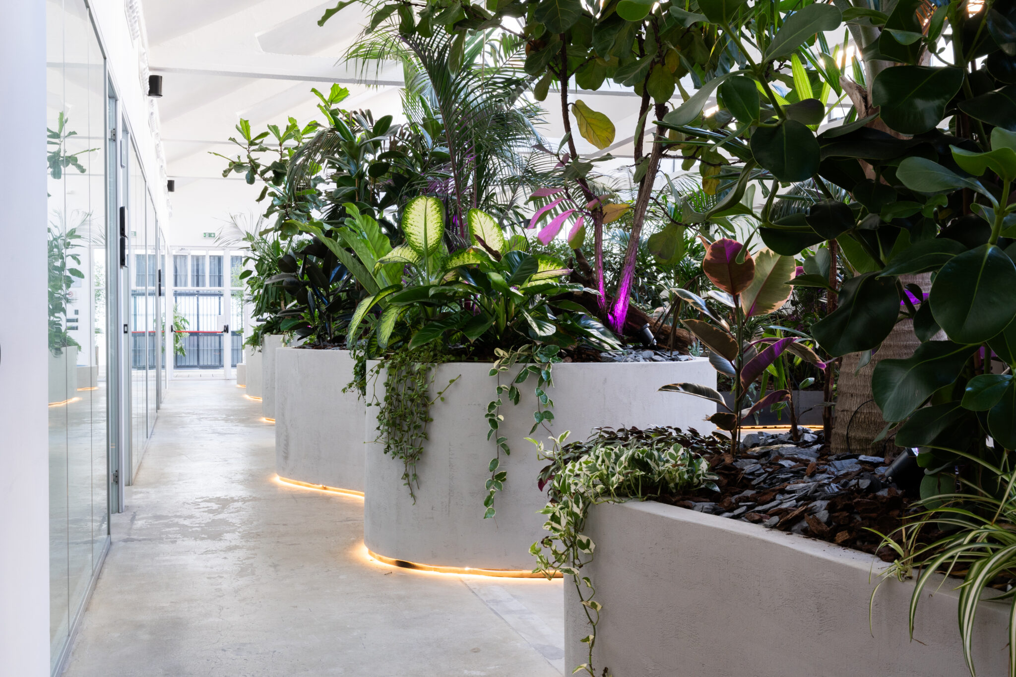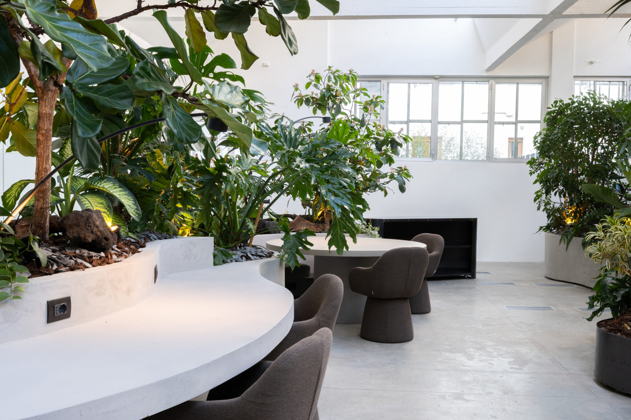 Un’area centrale di grandi dimensioni si apre su diverse zone connesse tra loro: ambienti vetrati, percorsi interni continui, spazi più raccolti e aree verdi integrate che scandiscono e separano le funzioni. La distribuzione favorisce la modularità e la lettura chiara dello spazio, mantenendo continuità visiva e profondità.