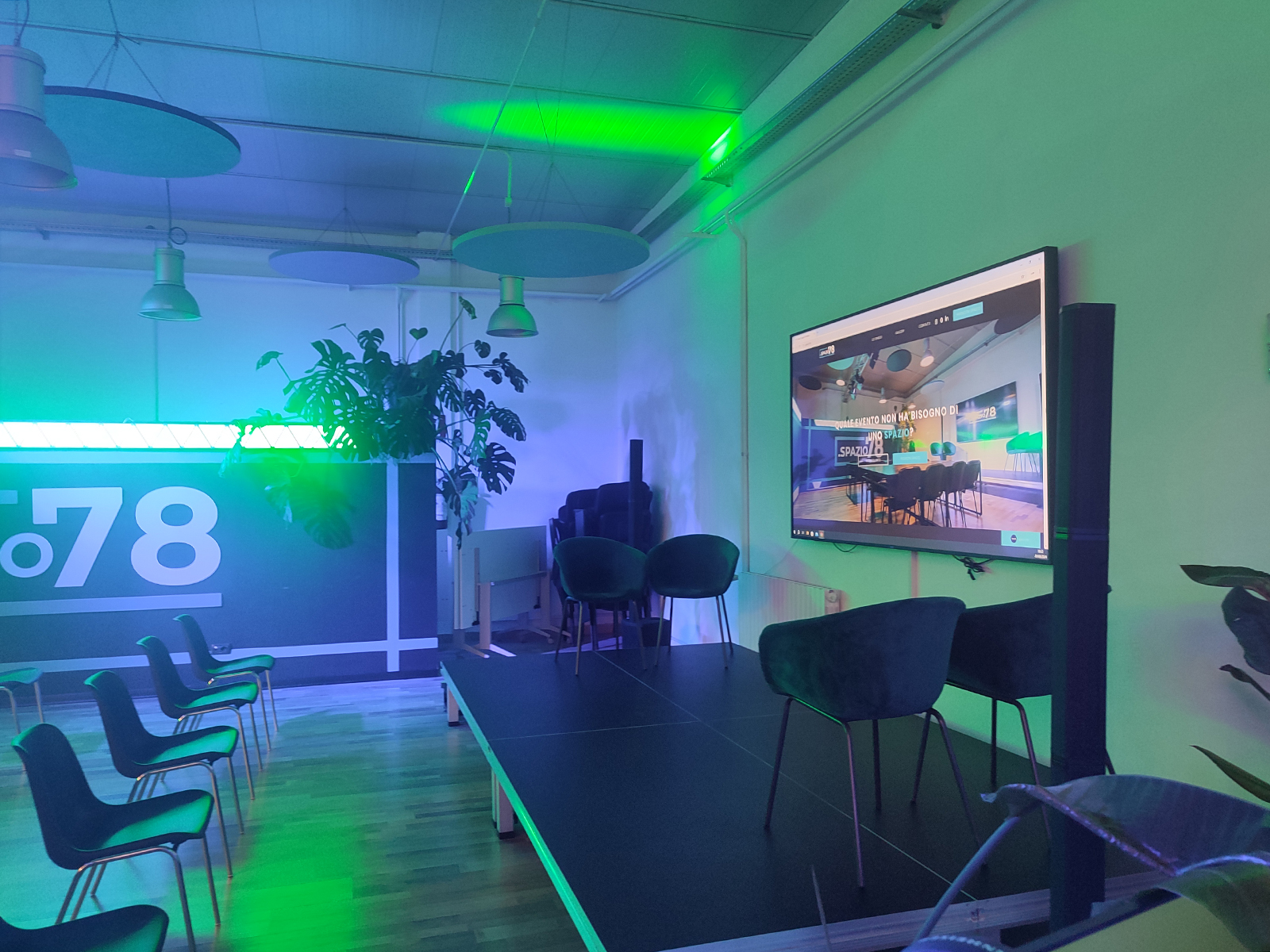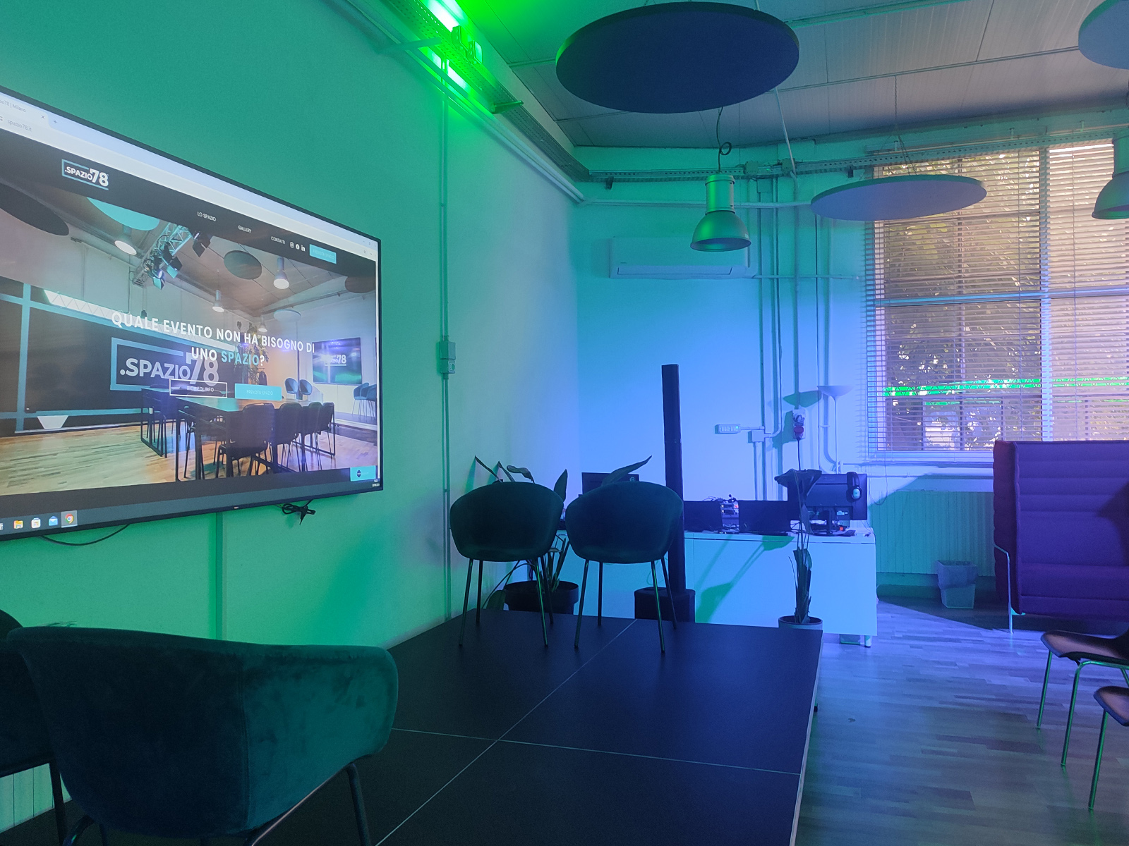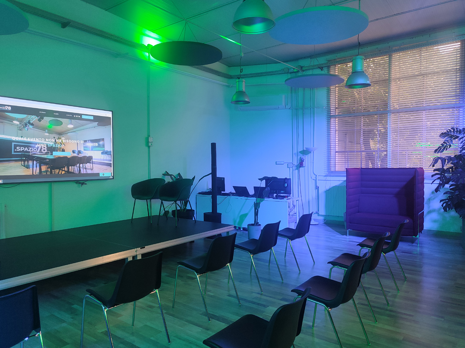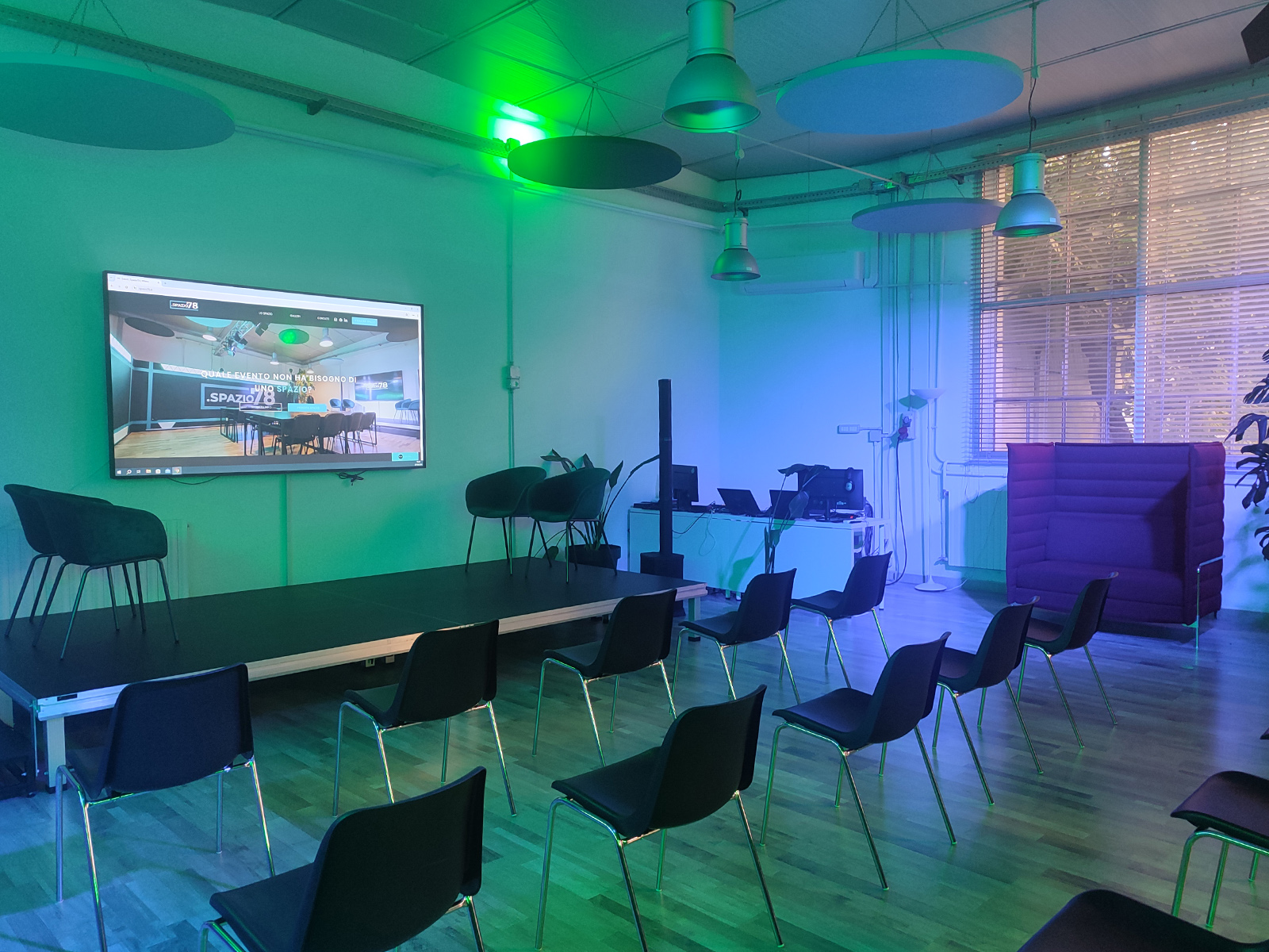 Il palco è allestito con sedie comode, adattabili al numero di relatori e moderatori, e dispone di uno schermo da 100 pollici per presentazioni o collegamenti esterni. La location è dotata di un avanzato sistema audio-video e di illuminazione, gestito da una regia dedicata.