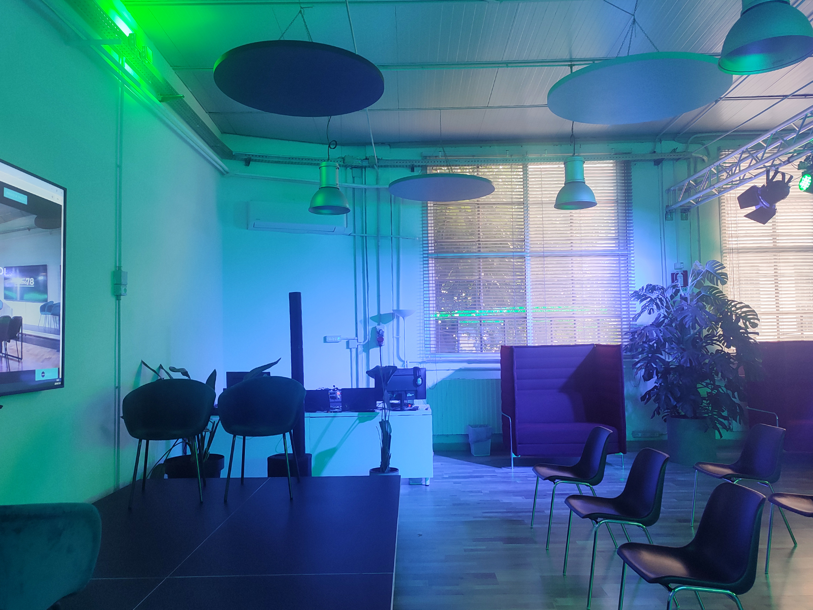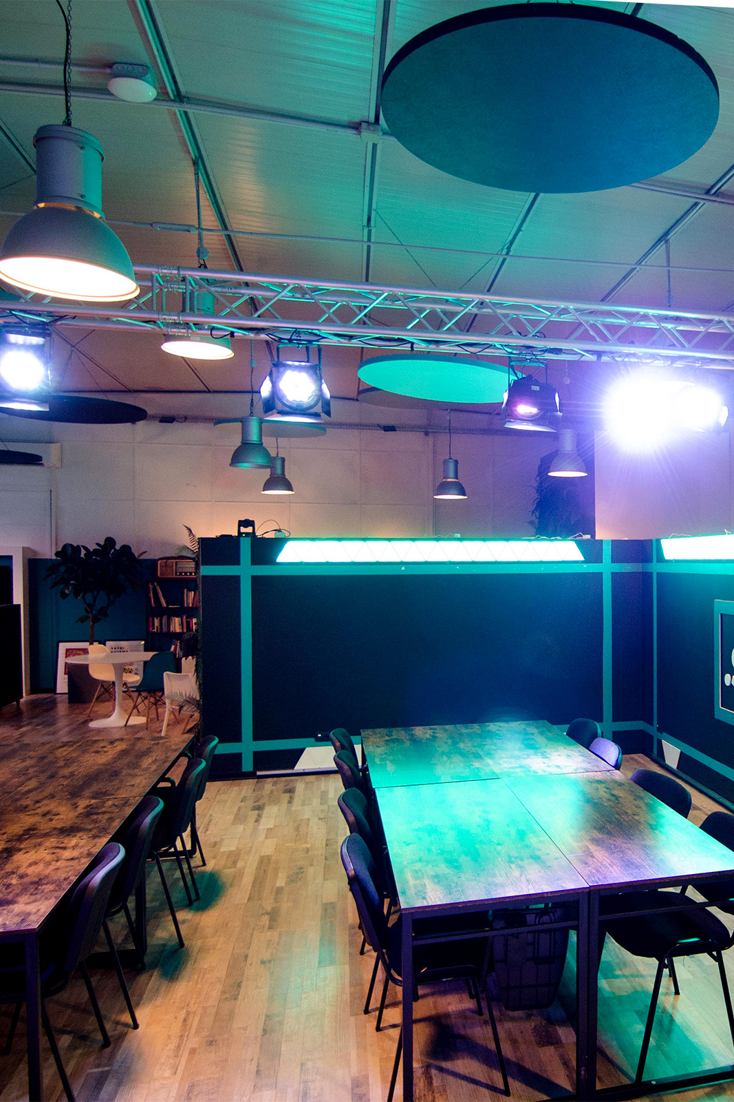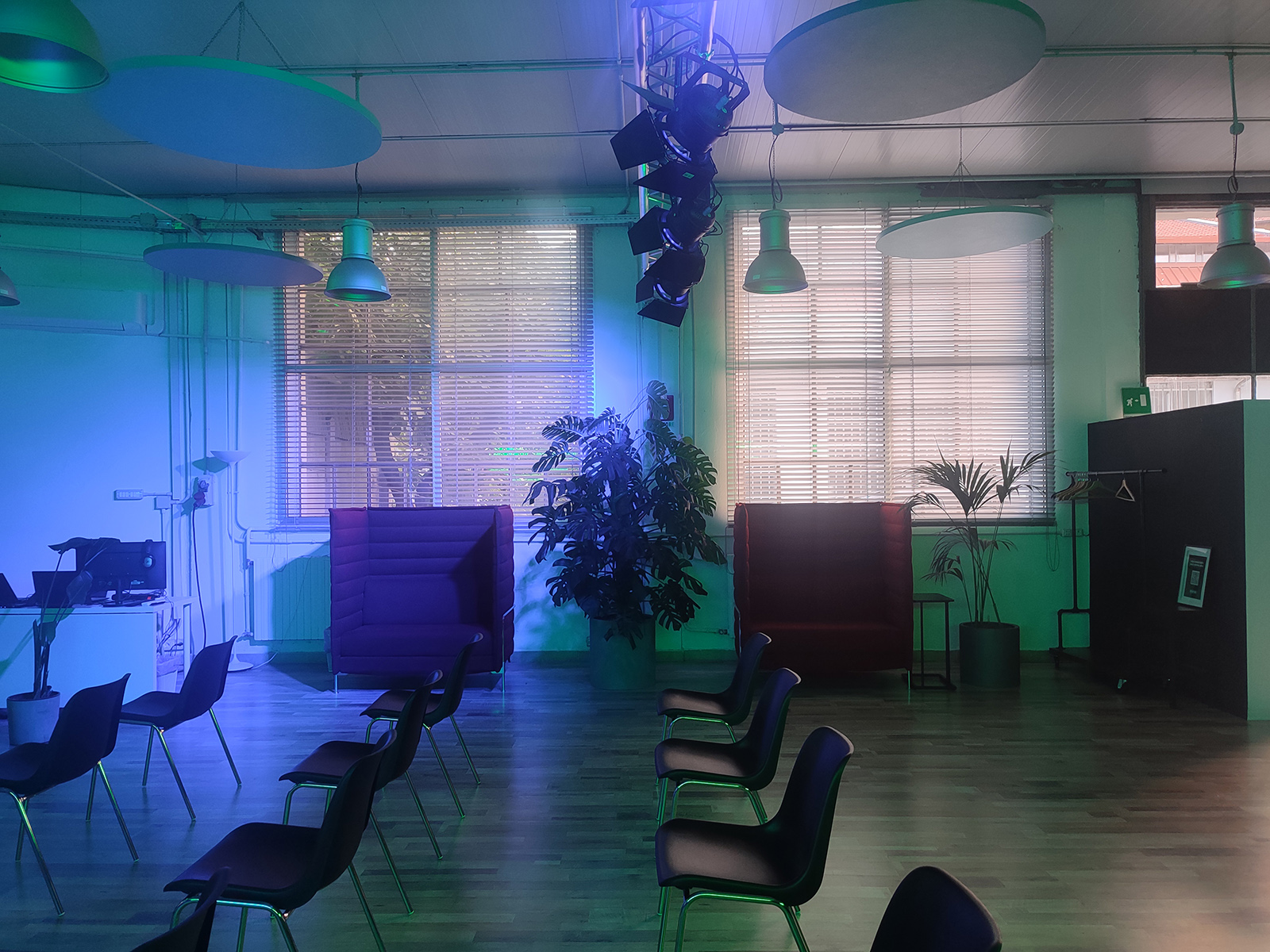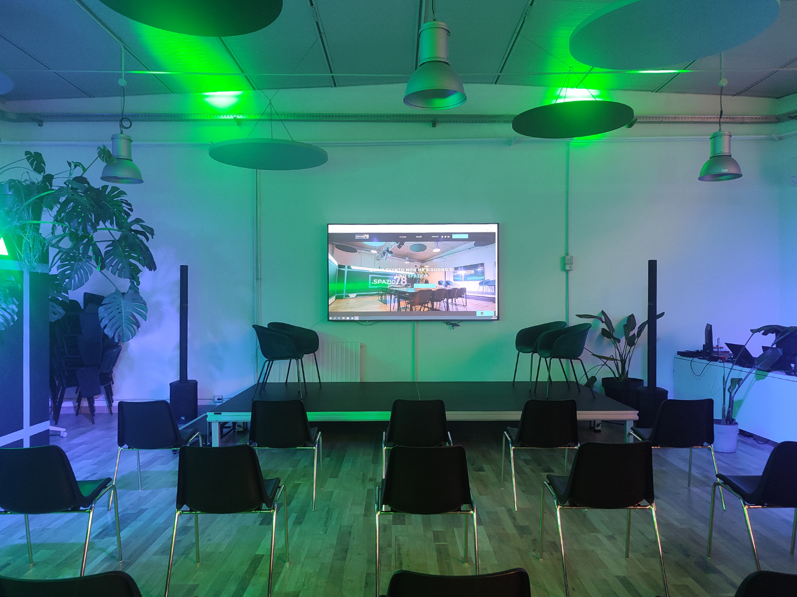 Il palco è allestito con sedie comode, adattabili al numero di relatori e moderatori, e dispone di uno schermo da 100 pollici per presentazioni o collegamenti esterni. La location è dotata di un avanzato sistema audio-video e di illuminazione, gestito da una regia dedicata.